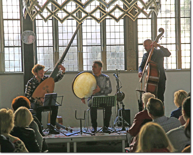 Francesco Cascarano, Hesam Asadi und Claas-Henning Dörries entführen in ungewöhnliche Klangwelten von Orient bis Okzident. Barockmelodien treffen auf kurdisch-iranische Musik und auf Eigenkompositionen. Ein orientalischer Imbiss rundete das Programm ab.